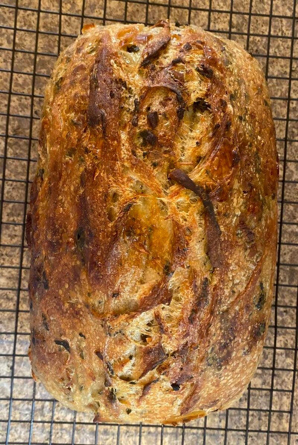 Artisan bread. High protein bread flour, spring water, and sea salt. Crunchy crust with a soft slightly tangy texture inside.Inclusions are added into our regular dough recipe for an added flavor of your choice.
